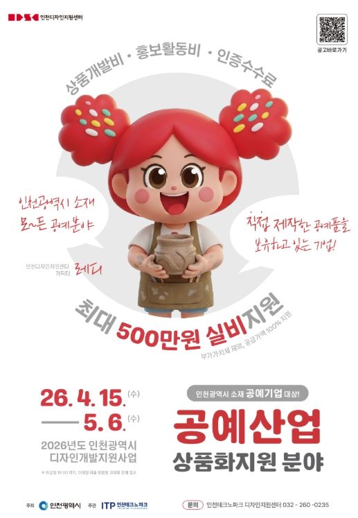 인사이드피플 심정보 기자 | 인천테크노파크(인천TP)는 인천 공예기업의 상품 경쟁력 강화를 위해 ‘2026년도 인천광역시 공예산업 상품화 지원사업’ 참여기업을 오는 5월 6일까지 모집한다.