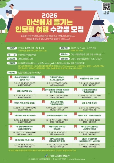 '2026 아산에서 즐기는 인문학 여행'은 ‘낭만으로 걷는 뮤지엄 산책’을 비롯해 클래식과 영화의 만남, 현대미술 및 세계 여행 테마, 건축, 동서양 철학 등 폭넓은 주제를 아우르는 총 18개 프로그램으로 기획됐다. 본 과정은 오는 5월 6일부터 7월 28일까지 진행되며, 각 강좌는 커리큘럼에 따라 2~4회차(회당 2~3시간)로 운영된다.