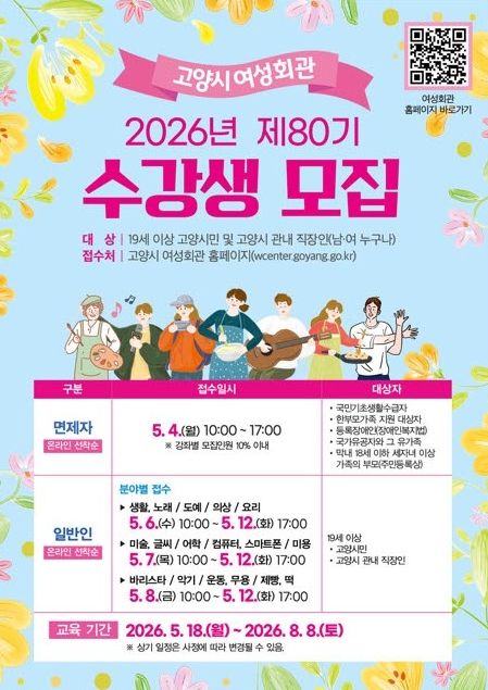 인사이드피플 노재현 기자 | 고양특례시 여성회관은 오는 5월 4일부터 12일까지 2026년 제80기 정규강좌 수강생을 모집한다.