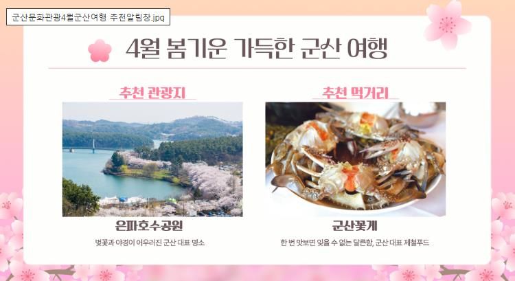 인사이드피플 노재현 기자 | 군산시는 계절과 시기에 맞는 관광 정보를 한눈에 제공하는 ‘월별 추천 콘텐츠 알림창 서비스’를 오는 5월부터 본격 운영한다고 밝혔다.