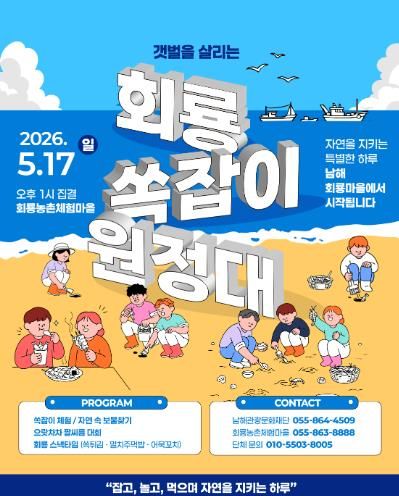 인사이드피플 노재현 기자 | 남해관광문화재단은 ‘2026 지역민 주도 소규모 축제 개최 지원 사업’의 일환으로 오는 5월 17일 일요일 오후 1시 ‘갯벌을 살리는 회룡 쏙잡이 원정대’ 축제를 개최한다.