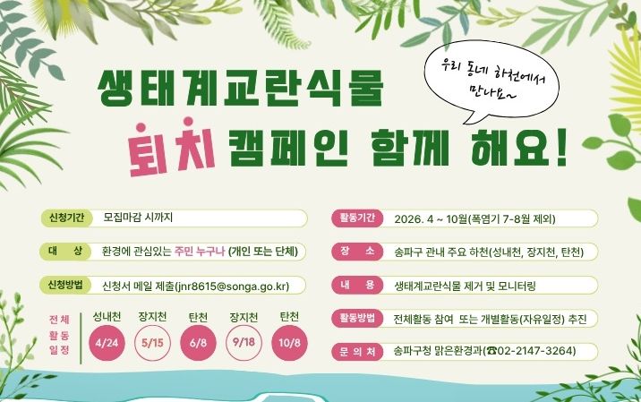 송파구는 4월 24일부터 10월까지 성내천·장지천·탄천 일대에서 ‘생태계교란식물 퇴치 캠페인’을 진행한다. 이번 활동은 지구의 날을 기점으로 송파구시설관리공단과 환경단체, 주민이 함께하는 민관 협력 방식으로 운영된다.