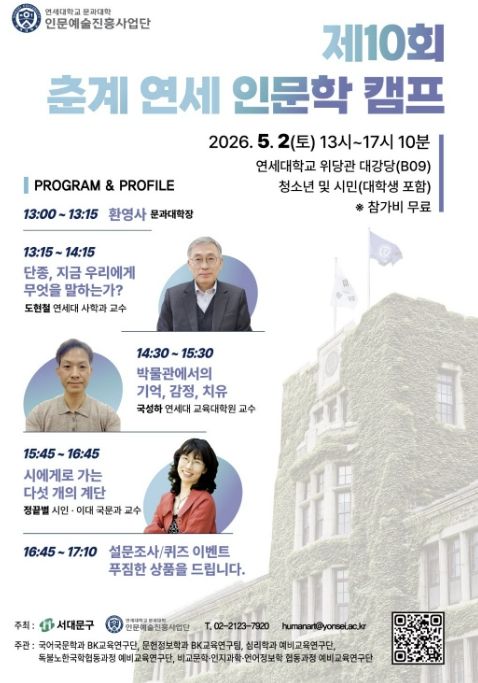 인사이드피플 노재현 기자 | 서대문구가 연세대학교 문과대학과 공동으로 5월 2일 오후 1시부터 5시 10분까지 연세대 위당관 대강당(B09호)에서 ‘제10회 연세 인문학 캠프’를 개최한다.