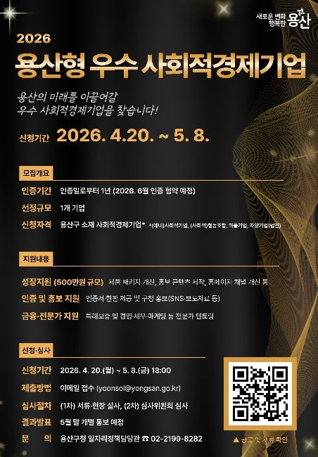 용산구는 지역 내 사회적경제기업 60여 곳을 대상으로 ‘2026년 용산형 우수 사회적경제기업 인증 사업’을 추진한다고 밝혔다. 이 사업은 서울 25개 자치구 가운데 처음 시행되는 것이다.