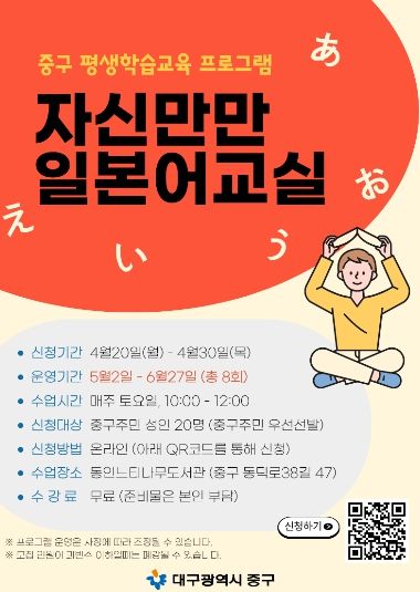 두 과정 모두 중구 주민 성인을 대상으로 과정별 20명을 모집하며, 수강료는 무료다. 신청은 4월 30일까지 대구광역시 중구 통합도서관 누리집(홈페이지) 및 대구 중구 생활문화센터 누리집에 안내된 QR코드를 통해 온라인으로 접수하면 된다.