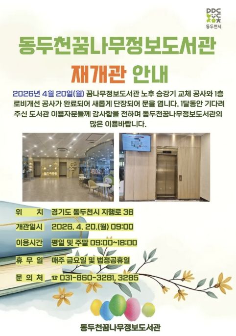인사이드피플 노재현 기자 | 동두천시 도서문화사업소 꿈나무정보도서관은 이용자 편의성과 안전성 강화를 위한 승강기 교체 공사와 1층 로비 환경개선 공사를 마치고 지난 4월 20일부터 재개관했다고 밝혔다.