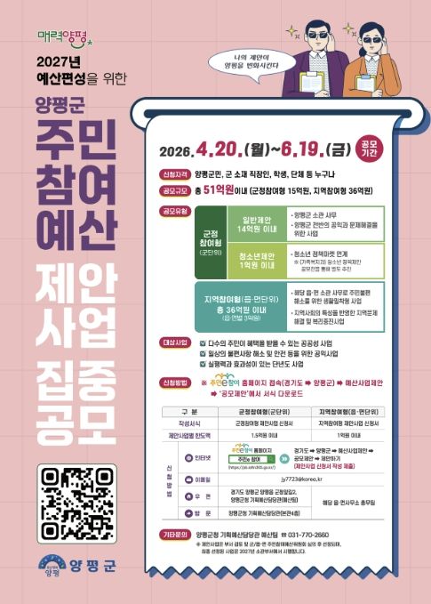 인사이드피플 노재현 기자 | 양평군은 오는 6월 19일까지 2027년 예산에 반영할 ‘주민참여예산 제안사업’을 집중 공모한다고 밝혔다.