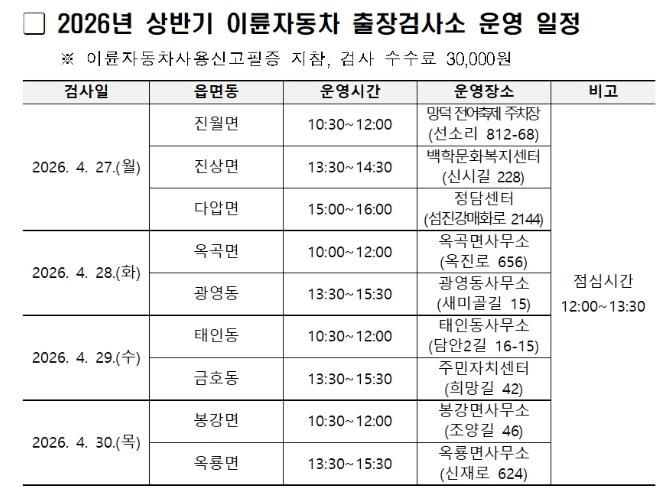 인사이드피플 노재현 기자 | 광양시는 이륜자동차 정기검사의 원활한 추진과 검사소가 없는 지역 주민의 편의를 위해 4월 27일부터 30일까지 한국교통안전공단과 합동으로 2026년 상반기 이륜자동차 출장검사소를 운영한다고 밝혔다.