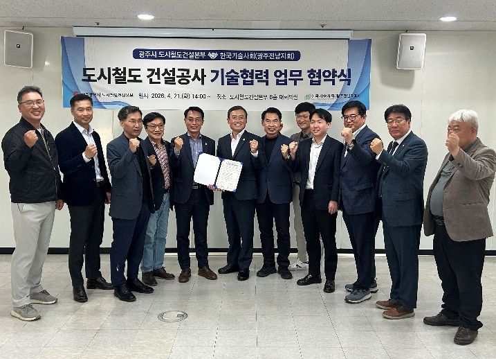 인사이드피플 노재현 기자 | 광주광역시 도시철도건설본부는 21일 본부 8층 대회의실에서 한국기술사회 광주·전남지회와 ‘광주시 도시철도 2호선 건설공사 기술협력 업무협약’을 체결했다.