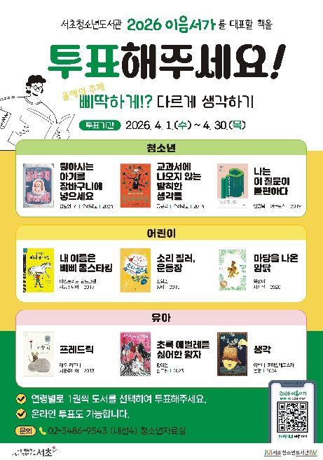 인사이드피플 노재현 기자 | 서울 서초구 서초청소년도서관은 주민과 한 권의 책을 선정해 함께 읽고 생각과 경험을 나누는 ‘2026 서청도 한 책 : 이음서가’ 운영을 위해 이달 말까지 올해의 대표 도서 선정 투표를 진행한다.