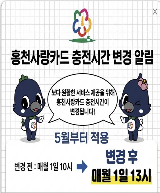 홍천군 관계자는 “충전 시간 조정은 이용자 불편을 줄이고 시스템 안정성을 높이려는 조치”라며, “앞으로도 홍천 사랑 카드를 더욱 편리하게 이용할 수 있도록 운영 관리에 힘쓰겠다”라고 말했다.