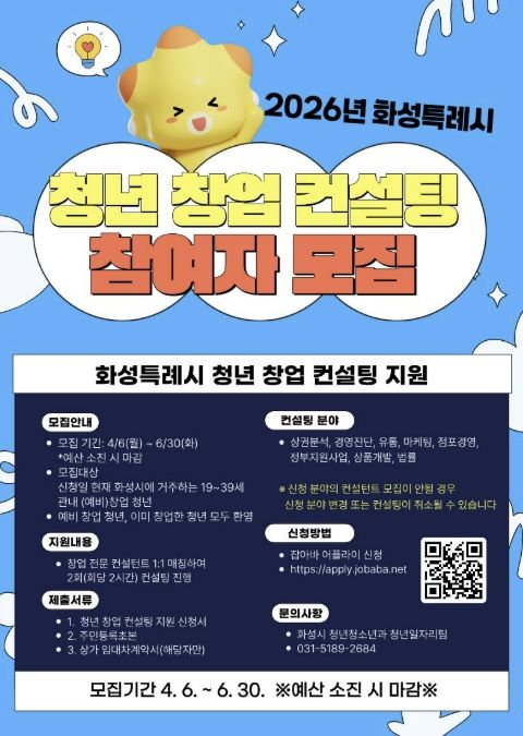 인사이드피플 노재현 기자 | 화성특례시는 오는 6월 30일까지 ‘2026년 청년 창업 컨설팅 지원사업’ 참여자를 모집한다.