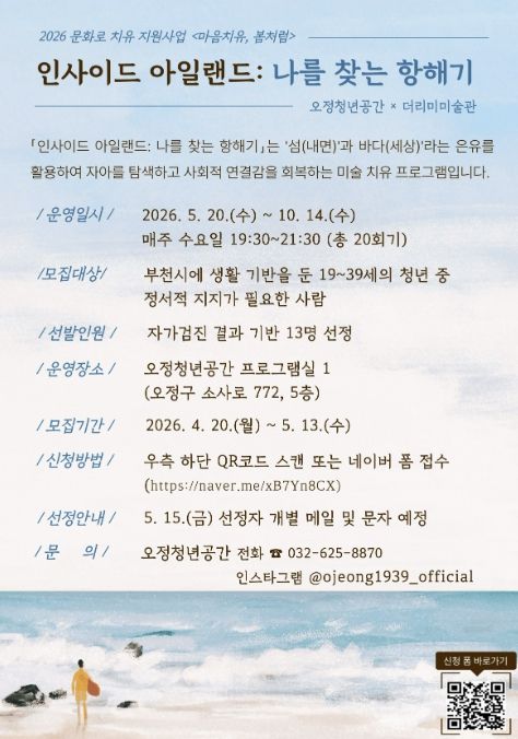 인사이드피플 노재현 기자 | 부천시는 오정청년공간에서 정서적 고립감을 겪는 청년을 위한 미술 치유 프로그램 ‘인사이드 아일랜드: 나를 찾는 항해기’ 참여자를 5월 13일까지 모집한다.