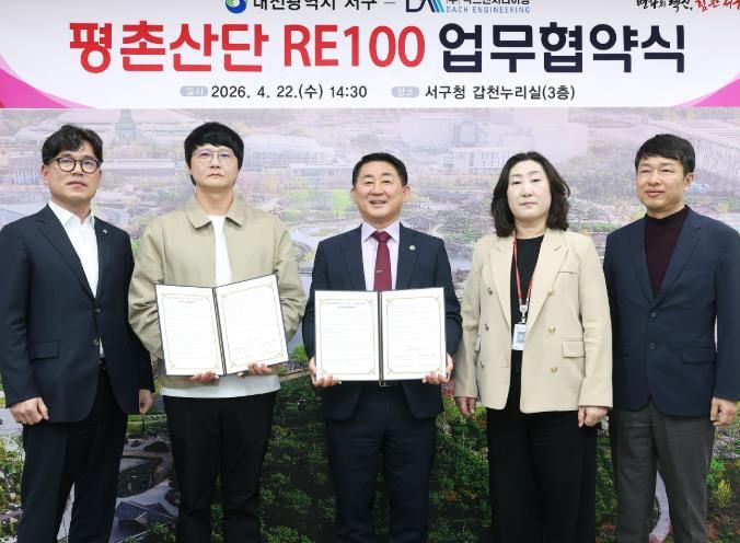 인사이드피플 노재현 기자 | 대전 서구는 22일 구청 갑천누리실에서 평촌일반산업단지 입주기업인 ㈜닥스엔지니어링과 재생에너지 보급 확산을 위한 ‘RE100 업무협약’을 체결했다.