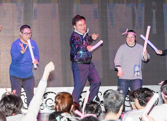 한 손에는 야광봉을 든 채 자리에서 펄쩍펄쩍 뛰며 현장 분위기를 한껏 끌어올렸다. 흘러나오는 음악에 맞춰 일명 막춤을 선보이며 15분간 온몸을 쉴 새 없이 움직였다. 무대를 내려와서도 장애인들 가운데로 들어가 함께 호흡하며 춤을 췄다.