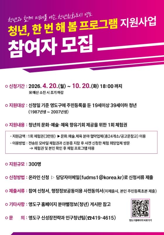 인사이드피플 노재현 기자 | 부산 영도구는 청년들에게 문화 향유 기회를 제공하고 지역 청년문화 활성화를 도모하기 위해 '청년, 한 번 해 봄 프로그램 지원사업' 참여자를 이달 20일부터 10월 20일까지 모집한다고 밝혔다.