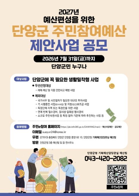 인사이드피플 노재현 기자 | 단양군은 군민이 예산편성 과정에 직접 참여해 지역에 꼭 필요한 사업을 제안할 수 있도록 ‘2027년 예산편성을 위한 주민참여예산 제안사업 공모’를 실시한다고 밝혔다.