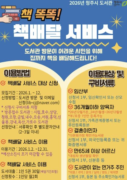 신청 대상은 △임신부 및 36개월 이하 영유아 양육자 △65세 이상 어르신 △결혼이민자 △도서관이 없는 면 지역(미원·가덕·문의·남이·현도·북이면) 거주 주민이다.