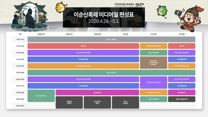 여해나루 외벽 미디어월에서는 영웅의 마지막 여정을 담은 이순신 반차도 미디어아트’와 관람객이 직접 참여하는 ‘디지털 행렬 체험’을 처음 선보인다. 또한 임진왜란 시기 조선의 화포와 화력 전술을 중심으로 해전의 전략과 군사기술을 조명하는 ‘화력조선’(국립진주박물관)을 비롯해, 예술의전당 공연영상 상연, 이순신 미디어아트, 한국 명작시를 감상할 수 있는 ‘빛의 벽, 시를 담다’ 등을 제공해 방문객들에게 수준 높은 문화예술 경험을 제공할 예정이다.