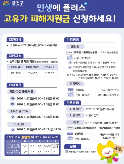 인사이드피플 김재윤 기자 | 금천구는 중동 정세 불안 등으로 촉발된 고유가·고환율·고물가 상황에서 구민의 생활 부담을 완화하고 지역경제를 활성화하기 위해 오는 27일부터 ‘1차 고유가 피해지원금’ 신청 접수 및 지급을 시작한다고 밝혔다.