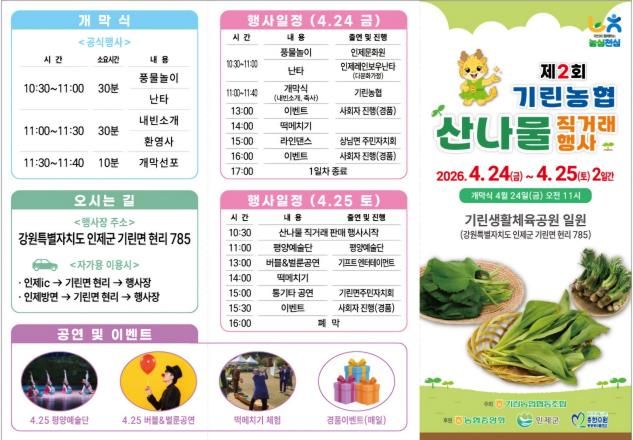 기린농협 관계자는 “이번 산나물 직거래 행사가 지역 농가에 실질적인 도움이 되고, 인제 산나물의 우수성을 널리 알리는 계기가 되길 바라며, 많은 주민과 관광객이 행사장을 찾아 신선한 산나물과 다양한 프로그램을 함께 즐기시길 기대한다”고 말했다.