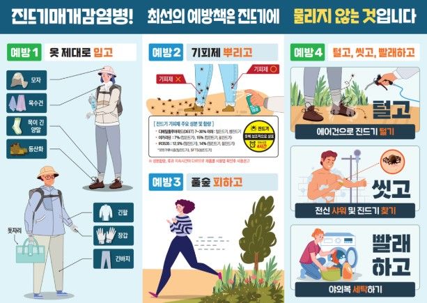 임승관 질병관리청장은 “SFTS 환자는 주로 4~11월에 농작업 및 야외활동 이후 발생하므로, 진드기에 물리지 않도록 긴 옷, 모자, 양말 등을 착용하여 노출 부위를 줄이고, 기피제를 사용할 것”을 강조하며, “야외활동 후 2주 이내 고열, 소화기 증상 등이 있을 경우 즉시 의료기관을 방문하여 진료받을 것”을 당부했다.