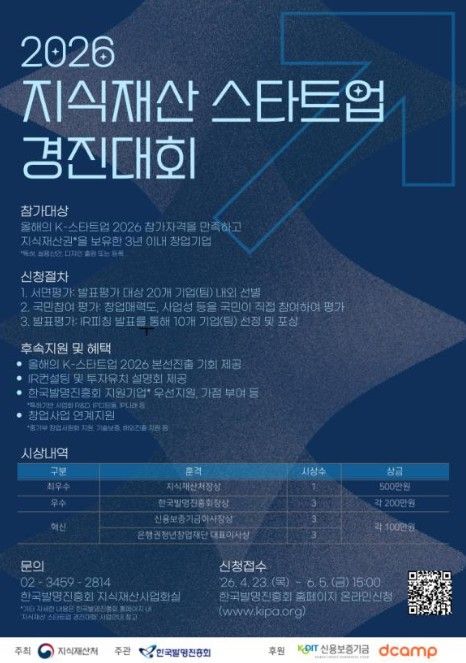 인사이드피플 심정보 기자 | 지식재산처는 신용보증기금, 은행권청년창업재단(디캠프), 한국발명진흥회와 함께 4월 23일 ~ 6월 5일까지'2026 지식재산 스타트업 경진대회'참가기업을 모집한다고 밝혔다.