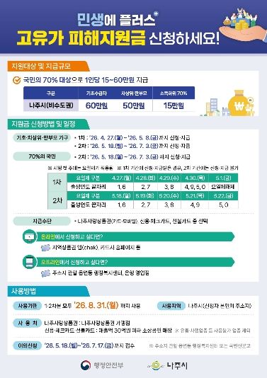 인사이드피플 노재현 기자 | 전남 나주시가 중동전쟁으로 인한 고유가·고환율·고물가로 어려움을 겪고 있는 시민들의 생활 안정을 위해 고유가 피해지원금 1차 지급을 4월 27일부터 시작하며 최대 60만 원을 지원하고 찾아가는 신청 서비스를 운영한다.