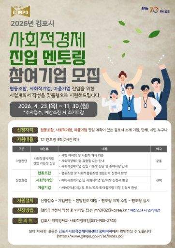 인사이드피플 이현진 기자 | 김포시는 협동조합, 사회적기업, 마을기업 등 사회적경제기업 진입을 지원하기 위해 ‘2026년 김포시 사회적경제 진입 멘토링’ 참여기업을 오는 11월 30일까지 수시 모집한다.