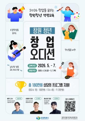 정성림 창원시 청년정책담당관은 “이번 청년 창업 오디션은 단순한 이론 교육을 넘어 현업 전문가들의 밀착 멘토링과 실질적인 사업화 지원을 받을 수 있는 좋은 기회”라며, “창원의 미래를 이끌어갈 참신한 아이디어를 가진 청년들의 많은 관심과 참가를 바란다”고 말했다.
