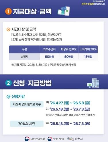 지급 대상은 올해 3월 30일 기준으로 순천시에 주민등록이 되어 있는 시민으로, 성인(2007년 12월 31일 이전 출생자)은 개인별 신청이 가능하며 미성년자(2008년 1월 1일 이후 출생자)는 주민등록상 세대주가 신청할 수 있다.