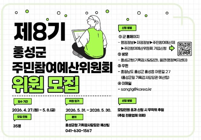 인사이드피플 노재현 기자 | 홍성군이 군정 재정운영에 군민의 목소리를 직접 담아낼 제8기 주민참여예산위원회 위원을 4월 27일부터 5월 8일까지 공개모집한다.