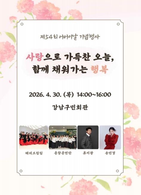 인사이드피플 강애자 기자 | 꿈이 모이는 도시, 미래를 그리는 강남구가 제54회 어버이날을 맞아 4월 30일 오후 2시부터 4시까지 강남구민회관에서 기념행사를 개최하고, 5월 8일에는 7개 노인복지관에서 다채로운 행사를 이어간다.