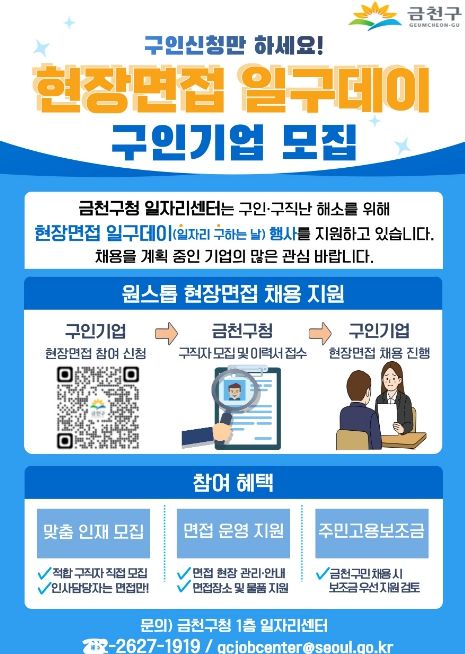인사이드피플 노재현 기자 | 금천구는 구인·구직난을 해소하고, 기업의 원활한 채용을 지원하기 위해 ‘현장면접 일구데이’ 참여 기업을 상시 모집한다고 밝혔다.