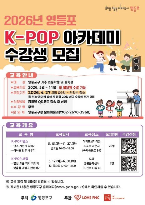 신청 대상은 영등포구에 거주하는 초등·중학생이다. 모집인원은 댄스반 20명, 보컬반 5명이며 수강료는 전액 무료다. 접수는 4월 27일 오전 9시부터 홍보물의 정보무늬(QR코드)를 통해 온라인 선착순으로 진행한다. 구는 매월 20일경 결원이 생기면 추가 모집을 진행해 더 많은 청소년에게 기회를 줄 계획이다. 더 자세한 사항은 문화예술과로 문의하면 된다.