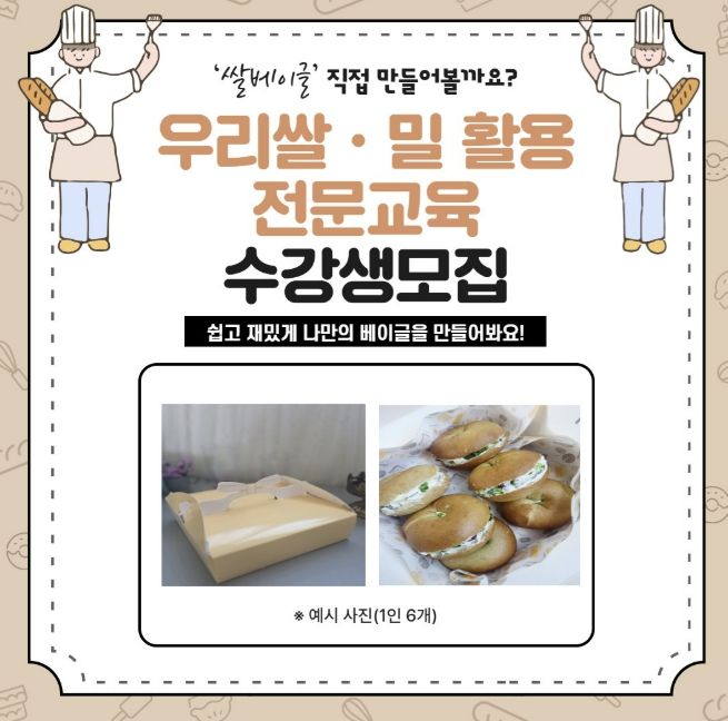 이번 교육은 우리 쌀을 활용한 ‘쌀 베이글과 쪽파 크림치즈 만들기’ 실습으로, 관내 부모와 자녀를 대상으로 운영된다.