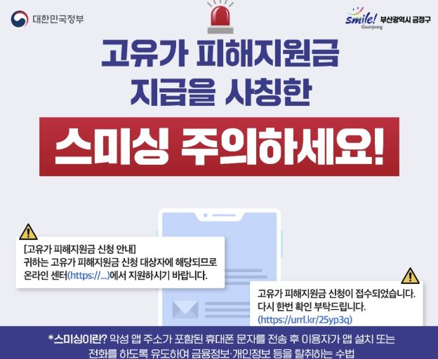 인사이드피플 노재현 기자 | 부산 금정구는 오는 4월 27일부터 ‘고유가 피해지원금’ 지급이 시작됨에 따라 이를 사칭한 스미싱(문자 결제 사기) 피해 예방을 위해 구민들에게 각별한 주의를 당부한다고 23일 밝혔다.