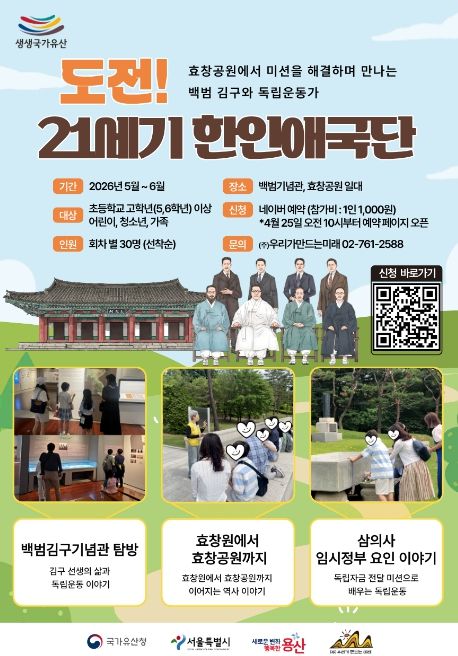 인사이드피플 노재현 기자 | 서울 용산구가 내달부터 11월까지 지역 내 국가유산 서울 효창공원(효창원로 177-18) 일대에서 ’효창공원이 생생, 독립운동이 생생‘ 프로그램을 운영한다.