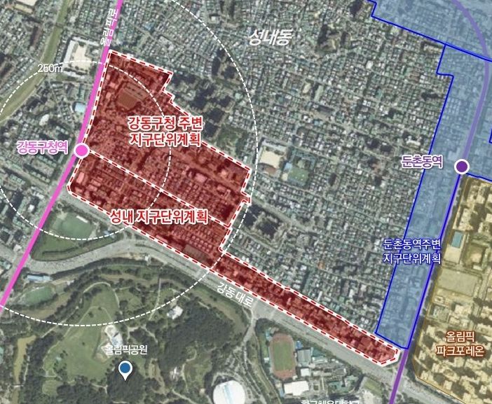 대상지는 성내동 451번지 일대, 약 38만 8천㎡ 규모이다. 구는 강동대로의 위상 변화에 발맞춰 강동구청역 일대 역세권 활성화 및 행정서비스 기능 강화를 도모하고자, 기존에 나뉘어 있던 강동구청 주변과 성내 일대 지구단위계획을 하나로 통합해 재정비를 추진해 왔다.