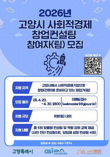 인사이드피플 이현진 기자 | 고양산업진흥원이 운영하는 고양시사회적경제지원센터가‘2026년 고양시 사회적경제 창업컨설팅 사업’에 참여할 예비 창업자(팀)을 오는 30일까지 모집한다.