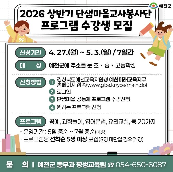 인사이드피플 노재현 기자 | 예천군은 4월 27일부터 5월 3일까지 2026년 상반기 단샘마을교사봉사단 프로그램 수강생을 모집한다.