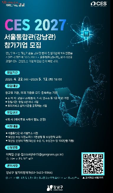 인사이드피플 노재현 기자 | 꿈이 모이는 도시, 미래를 그리는 강남구가 세계 최대 IT·전자 전시회인 CES 2027을 무대로 관내 스타트업의 글로벌 진출 지원에 나선다. 강남구는 ‘CES 2027 서울통합관(강남관)’에 참여할 스타트업을 4월 22일부터 5월 12일까지 모집한다.