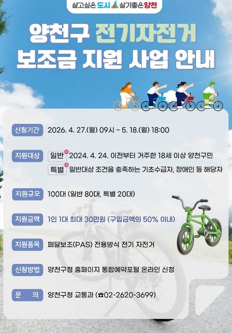 인사이드피플 노재현 기자 | 양천구는 탄소중립 실천과 구민의 이동 편의 증진을 위해 서울시 자치구 가운데 유일하게 시행 중인 ‘전기자전거 구입 보조금 지원사업’을 올해도 지속 추진한다고 27일 밝혔다.