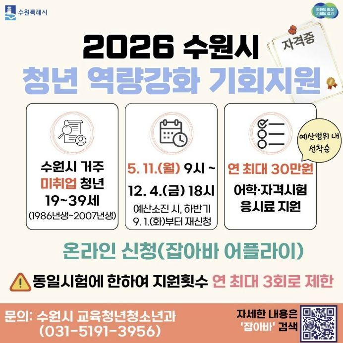 인사이드피플 노재현 기자 | 수원특례시는 미취업 청년의 취업 준비 비용 부담을 덜어주는 ‘청년 역량강화 기회 지원 사업’을 12월 4일까지 운영한다. 미취업 청년에게 어학·자격시험 응시료를 1인당 연 최대 30만 원 지원한다.