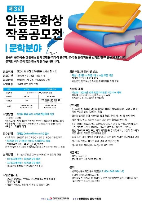 박덕규 안동문화상 운영위원장은 “올해 공모전은 문학과 미술 전반으로 참여의 폭을 넓히고 회화 분야를 통합 운영함으로써, 보다 자유롭고 다양한 창작을 이끌어낼 것으로 기대한다”며 “안동의 문화자원과 역사적 가치를 현대적 감각으로 풀어낸 작품들이 발굴돼, 지역문화의 새로운 가능성을 제시하는 계기가 되길 바란다”고 전했다.