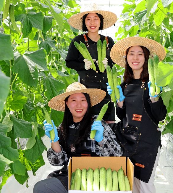 인사이드피플 노재현 기자 | 지난 24일 충북 괴산군 소수면 아성리의 한 스마트팜 연동하우스. 30도에 육박하는 하우스 열기 속에서 세 명의 젊은 여성이 오이 수확에 한창이다.