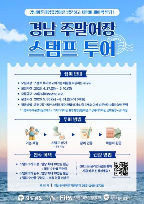 또한, 마을별 3회 이상 스탬프 투어를 완료한 팀에게는 팀당 최대 10만 원의 체험비를 지원하고, 경남 어촌 특화 상품도 별도 제공할 예정이다.