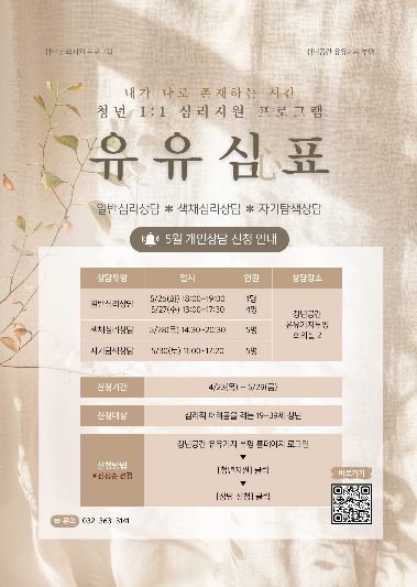 ‘유유심(心)표’는 전문 상담가와 함께하는 청년 맞춤형 프로그램으로, 심리적 어려움을 겪는 청년들이 일상 속에서 자신만의 쉼표를 찾고 정서적 안정을 회복할 수 있도록 돕는다.