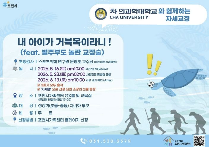 인사이드피플 노재현 기자 | 포천시 더 큰 행복 포천시가족센터는 오는 5월 16일부터 6월 13일까지 성장기 자녀를 둔 가족을 대상으로 부모역할지원사업 ‘내 아이가 거북목이라니! feat.별주부도 놀란 교정술’ 프로그램을 운영한다.