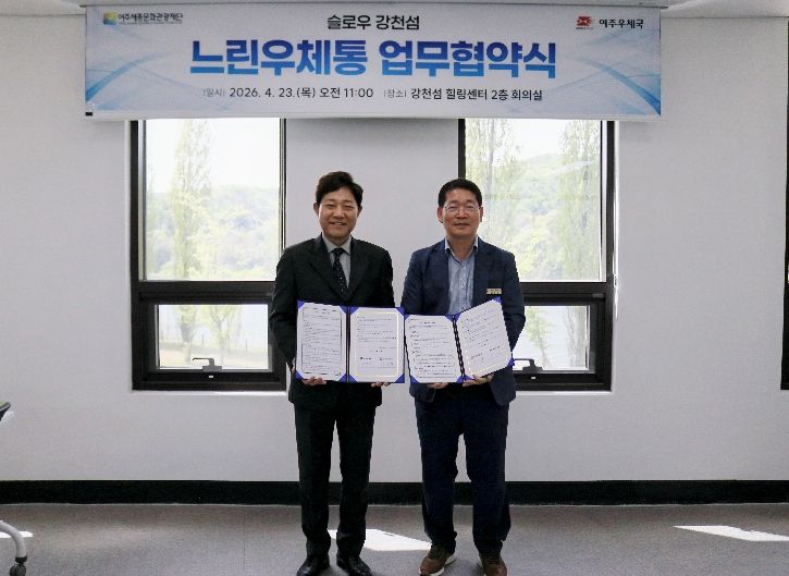 인사이드피플 노재현 기자 | 여주세종문화관광재단과 여주우체국은 4월 23일 강천섬 힐링센터에서 ‘슬로우 강천섬 느린우체통 업무협약(MOU)’을 체결했다. 빠르게 흘러가는 일상 속에서 잠시 걸음을 멈추고, 소중한 사람에게 미래의 마음을 전할 수 있는 감성 관광콘텐츠를 공동으로 운영하기 위해서다.